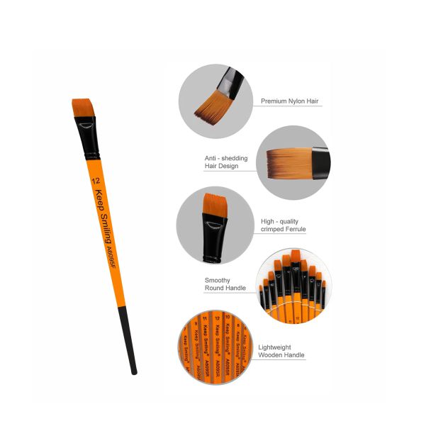 Keep Smiling Acrylic Flat Brush Pack Of 10 Flat yellow Pointed Tip Nylon Hair Artist Acrylic Brush for Acrylic Watercolor Oil Painting. This synthetic mini-detail paint brush set is perfect for watercolor, acrylic, enamel, oil, cel-vinyl, or gouache paints. Individually handcrafted and double-crimped with excellent workmanship, there is no flaking paint from handles, loose bristles, or ferrules with this fine art brush set. Brush nylon hairs stay soft and flexible after cleaning, and they don’t fall apart after cleaning either.