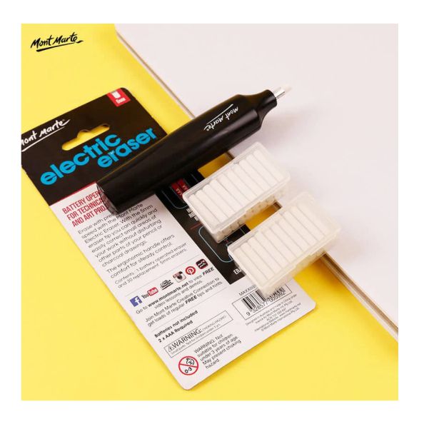 Improve your erasing accuracy, with the Mont Marte Electric Eraser containing 30 refills. This electric eraser is ideal for artists, drafts and students. It erases graphite, charcoal, and colored pencil lines effortlessly and smoothly, with great accuracy. The ergonomic design allows comfortable and easy use for long periods of time, while the electric marker motor continues to function smoothly. Refills are also included for easy and simple erasing regardless of mark type or size, from fine and extremely detailed lines to broader strokes. With the Mont Marte Electric Eraser you will be able to erase and eliminate blemishes easily, refine sketches, make mistakes less noticeable and add highlights.