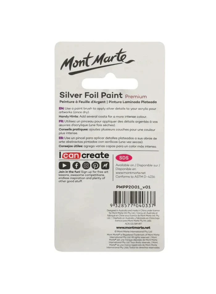 Add a touch of elegance to your artwork with Mont Marte Premium Silver Foil Paint in 20ml tubes. This exquisite paint features a metallic silver finish that enhances any project with a shimmering, reflective effect. Ideal for fine art, crafts, and DIY projects, it applies smoothly and dries quickly on various surfaces including canvas, wood, and paper. The water-based formula ensures easy cleanup and allows for seamless blending with other colors. Whether you’re a professional artist or a hobbyist, Mont Marte Premium Silver Foil Paint offers unmatched quality and brilliance to elevate your creative endeavors.