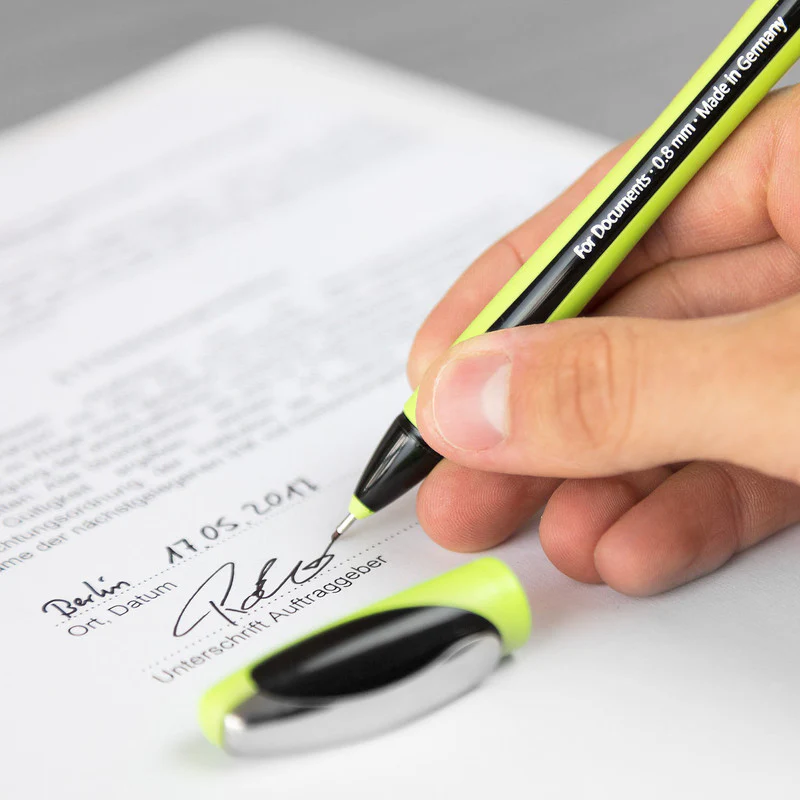 Premium fineliner for expressive and striking writing, line width approx. 0.8 mm. . The water-based inks are suitable for documentary use according to ink standard ISO 14145-2. Ergonomically shaped, generously rubberised barrel designed for relaxed writing without hand fatigue. The fibre tip glides extremely gently and is stabilised with a stainless steel tube that even enables you to work with a ruler and template. The cap-off ink does not run dry even if the cap is removed for 2-3 days. The cap has a sturdy metal clip and fits neatly on the end of the barrel.