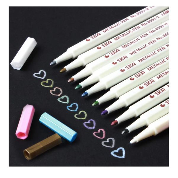 Nationwide and many clients around the globe have requested that we create an even larger version of the popular STA Metallic Color Pen. It will be offered in 10 colours (currently 10), plus many more! As with the original STA Metallic Color Pen, and all the new versions, they will be made using the very best quality gel ink available. No compromising. The STA Metallic Color Pen has been crafted specifically with the needs of both serious and casual artists in mind. All types of art supplies can be enhanced using the STA Metallic Colour Pen (wherever appropriate).